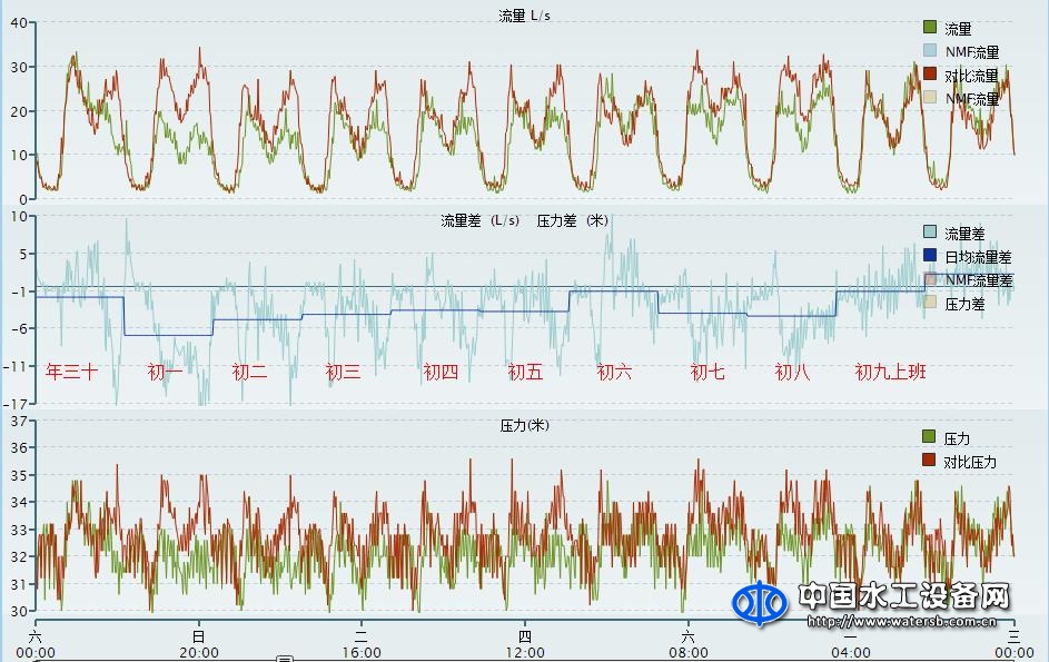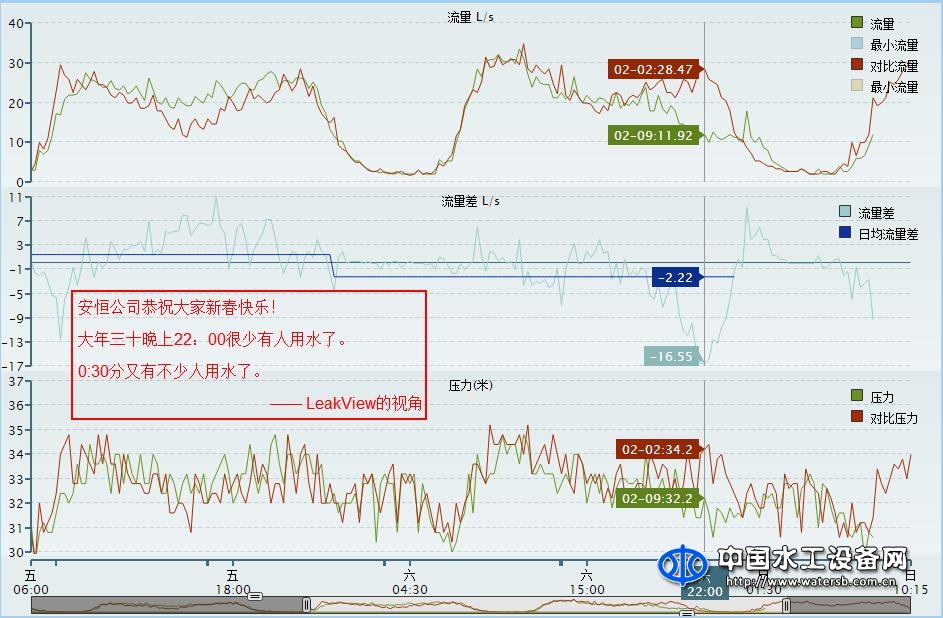 在水聯網®理念的指導下,安恒集團自主研發的WaterViewTM——Leakview®系統,不僅解決了供水管網的正常運行的實時監測功能,還利用系統自身基于物聯網的豐富數據和優異的大數據分析能力,為智能化城鎮供水整體管理帶來更多的設想。例如某年大年三十晚間的對于社區流量和壓力的監測數據,表明大年三十當天從下午五點開始減少用水,當晚十點用水量大幅降低,而凌晨0點半用水量突然增大,而后快速滑落等等數據,都反映出大年三十該社區居民的生活用水習慣。而針對居民區春節期間的用水量和壓力數據,更能分析出該小區的人員結構和生活方式,這都對未來智慧化城市管理提供了基礎性的設想依據。