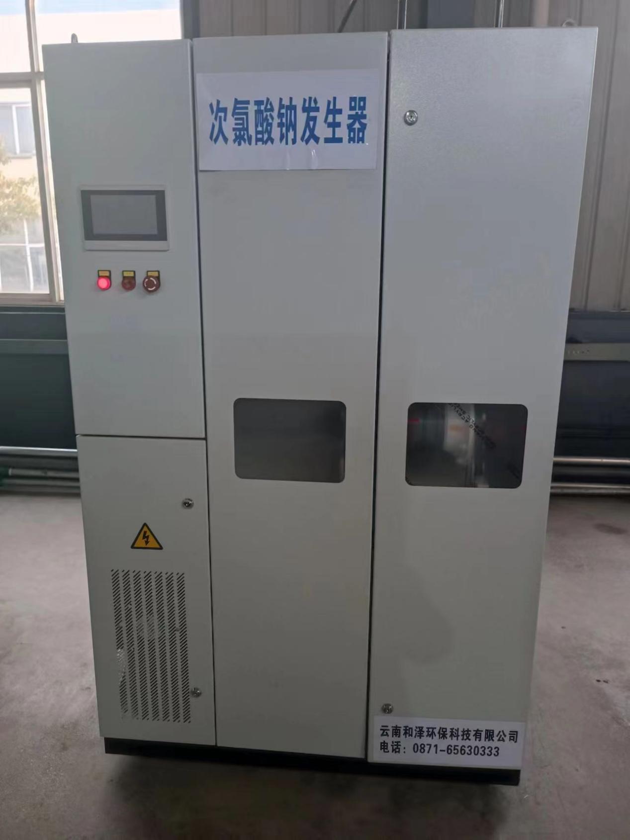 2 、主機(jī)部分:是整個(gè)裝置的核心部分,主要包括稀鹽配比單元,電解單元。 稀鹽配比單元用軟化水和飽和食鹽水按照一定的比例稀釋成濃度為 28-32g/L 的 稀鹽水,作為電解液使用;電解單元是整個(gè)電解反應(yīng)發(fā)生的場(chǎng)所,采用直流電的 方式對(duì)稀鹽水進(jìn)行電解制取次氯酸鈉消毒液。