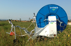 卷盤式噴灌主要由底架、卷盤、PE管、水渦輪、變速箱、速度補償裝置和噴水車組成,其工作原理是利用水壓通過水渦輪、變速箱以及傳動系統轉動卷盤,從而帶動輸水管地塊的一端向主機方向一端回卷,噴水行車在設定的速度下勻速往回行走,邊行走邊噴水,直至完成整個地塊的灌溉。卷盤式噴灌機本身不需要額外的動力,它是依靠進入系統的水壓力來完成所有工作的。卷盤式噴灌機在市場上主要銷售兩種機型,分別是單噴頭卷盤式噴灌和多噴頭桁架噴灌。