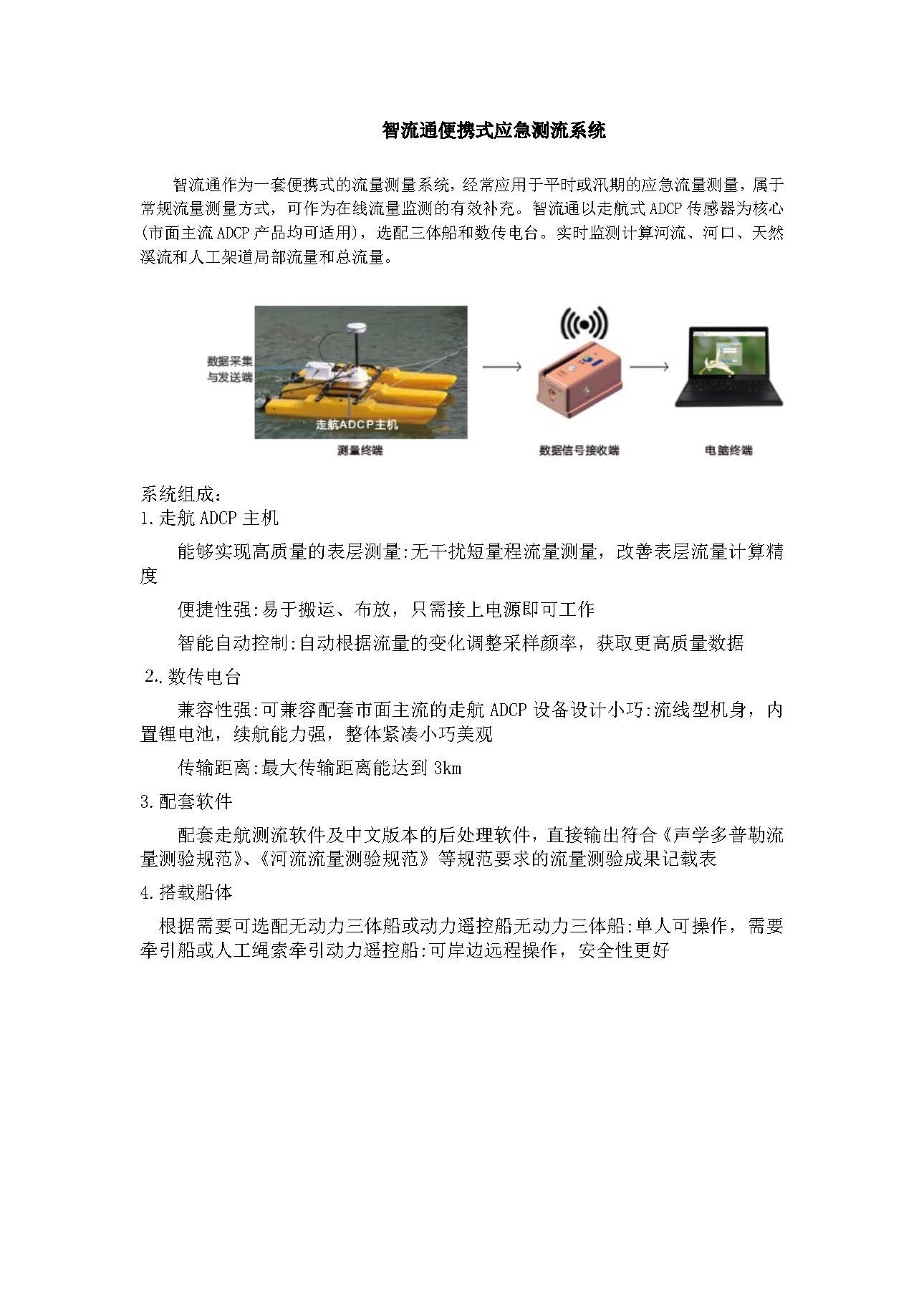 智流通作為一套便攜式的流量測量系統,經常應用于平時或汛期的應急流量測量,屬于常規流量測量方式,可作為在線流量監測的有效補充。智流通以走航式ADCP傳感器為核心(市面主流ADCP產品均可適用),選配三體船和數傳電臺。實時監測計算河流、河口、天然溪流和人工架道局部流量和總流量。