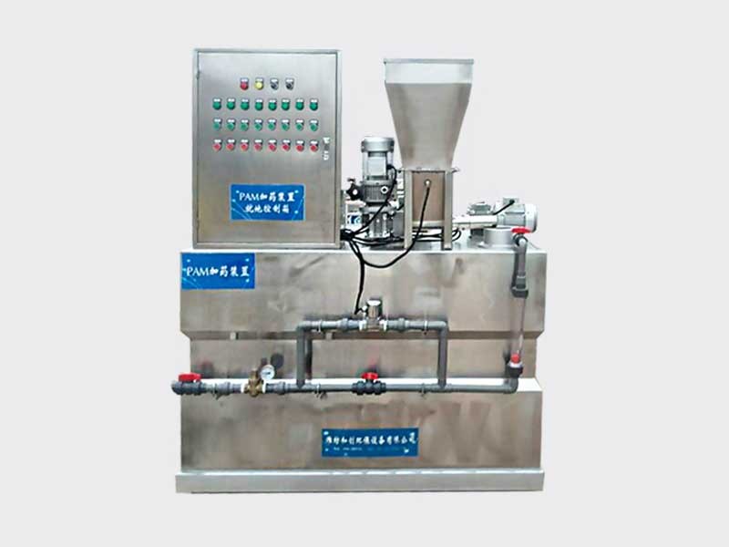 是一種將聚丙烯酰胺顆粒與水按一定比例配制、溶解、熟化,精確投加至水中的全自動(dòng)成套投加設(shè)備。其主要工作流程為吸料機(jī)吸料、密閉料倉(cāng)存儲(chǔ)、精確給料機(jī)給料、不銹鋼溶解罐溶解配制,螺桿泵投加至投加點(diǎn),以達(dá)到助凝目的。
