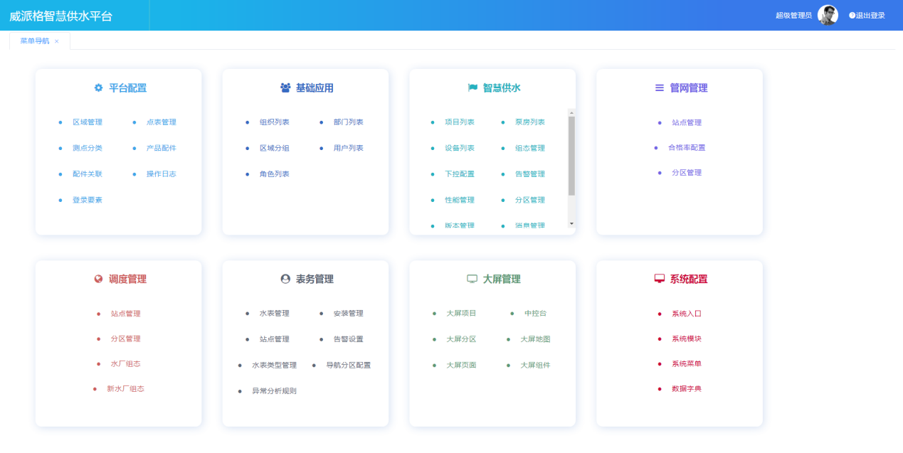 智慧供水管理平臺(tái)的后臺(tái)。該平臺(tái)可支持針對(duì)一些常見的客戶個(gè)性化需求進(jìn)行配置,代替編程開發(fā)??晒]有編程基礎(chǔ)的公司內(nèi)部平臺(tái)交付部門或外部客戶使用??膳渲脙?nèi)容包括平臺(tái)功能顯示、數(shù)據(jù)顯示、人員管轄區(qū)域權(quán)限、操作權(quán)限等。