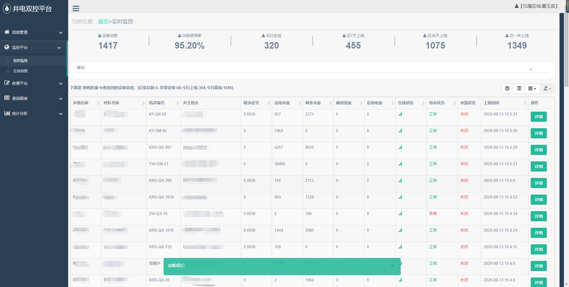 查看的內(nèi)容包括機(jī)電井的產(chǎn)權(quán)人、經(jīng)緯度、當(dāng)前運(yùn)行狀態(tài)、用水量、剩余水量、剩余金額、所屬鄉(xiāng)鎮(zhèn)等等。
